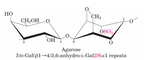 The rigid component of bacterial cell walls is a hetero polymer of alternating (β1 →4)-linked N-acetylglucosamine and N-acetylmuramic acid residues (Fig. 7–22). The linear polymers lie side by side in the cell wall, cross linked by short peptides, the exact structure of which depends on the bacterial species. The peptide cross-links weld the polysaccharide chains into a strong sheath that envelops the entire cell and prevents cellular swelling and lysis due to the osmotic entry of water. The enzyme lysozyme kills bacteria by hydrolyzing the (β1 →4) glycosidic bond between N-acetylglucosamine and N acetylmuramic acid (see Fig. 6–24). Lysozyme is notably present in tears, presumably as a defense against bacterial infections of the eye. It is also produced by certain bacterial viruses to ensure their release from the host bacterial cell, an essential step of the viral infection cycle. Penicillin and related antibiotics kill bacteria by preventing synthesis of the cross-links, leaving the cell wall too weak to resist osmotic lysis (see Box 20–1). Certain marine red algae, including some of the sea weeds, have cell walls that contain agar, a mixture of sulfated heteropolysaccharides made up of D-galactose and an L-galactose derivative ether-linked between C-3 and C-6 (Fig. 7–23). The two major components of agar are the unbranched polymer agarose (Mr ~120,000) and a branched component, agaropectin. The remark able gel-forming property of agarose makes it useful in the biochemistry laboratory. When a suspension of agarose in water is heated and cooled, the agarose forms a double helix: two molecules in parallel orientation twist together with a helix repeat of three residues; water molecules are trapped in the central cavity. These structures in turn associate with each other to form a gel— a three-dimensional matrix that traps large amounts of water. Agarose gels are used as inert supports for the electrophoretic separation of nucleic acids, an essential part of the DNA sequencing process (p. 8-24). Agar is also used to form a surface for the growth of bacterial colonies. Another commercial use of agar is for the capsules in which some vitamins and drugs are packaged; the dried agar material dissolves readily in the stomach and is metabolically inert.