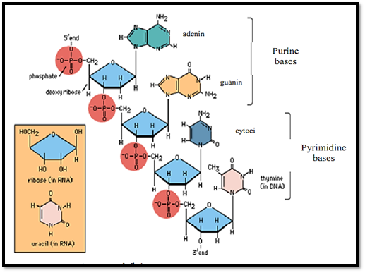 ويمكن بإنجاز القول ان تركيب الحامض النووي DNA ذو طبيعة تسمح له بحمل المعلومات الوراثية، بالإضافة الى ان طبيعة هذا التركيب تسمح له ايضا بمضاعفة نفسه. ويمكن ان ترتبط النيوكلوتيدات Nucleotides بروابط تساهمية باي نظام لتكوين بوليمرات عديدة الوحدات وطويل Long polymers، وكما ذكرنا فكل بناء من قوالب الحامض النووي DNA عبارة عن نيوكليوتيد Nucleotide يتكون من سكر خماسي وهو الديوكسي ريبوز Deoxyribose وفوسفات phosphate وقاعدة نيتروجينية Nitrogen base. والقواعد النيتروجينية تتضمن مجموعتان من البيورين purines وتتضمن الادينين Adenine (A) والجوانين Guanine (G) اما المجموعة الثانية فهي البيريميدين pyrimidines. وتشتمل على الثايمين Thymine (T) والسيتوسين (C) Cytosine، وترتبط النيوكليوتيدات ببعضها بواسطة روابط تساهمية لتكوين عمود فقري من تعاقب السكر والفوسفات Sugar-Phosphate backbone. والنيوكليوتيدات ترتبط ببعضها عن طريق الروابط التساهمية التي تربط ذرة الكربون الثالثة في جزيء سكر بالفوسفات المرتبطة بذرة الكربون الخامسة فــــي جزيء السكر المجاور ليكون 3,5 phosphodiester linkage.