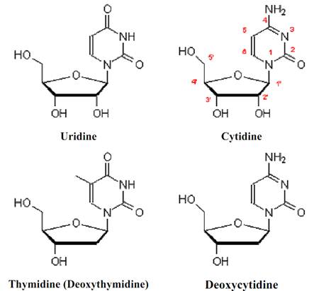 ويلاحظ انه اذا نزعت مجموعة الفوسفات من النيوكليوتيد اطلق على الكواكب الباقي اسم نيوكليوسيد nucleoside. وعلى ذلك فالنيوكليوسيدات المعرفة (شكل 3) هي ادينوسين adenosine، جوانوسين guanosine، سيتيدين cytidine، يوريدين uridine، ثايميدين thymidine، ويضاف المقطع الاولي (دي اوكسي) – Deoxy للدلالة على الدي اوكسي نيوكليوسيدات deoxyribonucleosides.