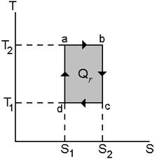 يأخذ مثل هذا المنحنى (المخطَّط) شكلاً بسيطاً عندما نُمثِّل دورة كارنو، والتي هي كما قلنا سابقاً عبارة عن عمليَّتيْن أيزوحراريَّتيْن (T = constant) محدودتيْن بعمليَّتيْن أدياباتيَّتيْن (S = constant). يُبيِّنُ الشكل 4-5 التالي مخطَّط T-S لدورة كارنو a-b-c-d-a. تُمثِّل العمليَّة الأيزوحراريَّة المنعكسة الأولى a-b بخط مستقيم مواز للمحورT معادلته هي T = T2 ويصل بيْنَ النقطتيْن a و b وتُمثِّل العمليَّة الأدياباتيَّة المنعكسة الأولى b-c (السريان الحراري يُساوي صفراً والإنْتروبي ثابتة) بخط مستقيم مواز للمحور Tمعادلته هي S = S2 وبيْنَ النقطتيْن b و c. وبطريقة مُشابهة يُمثِّل الخط المستقيم T = T1 بيْنَ النقطتيْن c و d والخط المستقيم S = S1 ، والواصل بيْنَ النقطتيْن d و a ، العمليَّة الأيزوحراريَّة المنعكسة الثانية c-d والعمليَّة الأدياباتيَّة المنعكسة الثانية S = S1 على الترتيب.