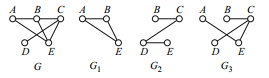 Figure 1.2 shows a graph G and three of its subgraphs: a cycle G1 (a copy of C3), a path G2 (a copy of P4), and another subgraph G3, which is a tree. Note that the cycle G1 could be denoted (A,B,E), (B,E,A), (E,A,B), (A,E,B), (E,B,A) or (B,A,E); a cycle has no intrinsic start or finish point, and a copy ofCn can be written (as a list of vertices) in 2n ways. On the other hand, to specify a path, you must start at one of its endpoints; G2 can be written either as (B,C,D,E) or as (E,D,C,B).