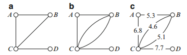 There will often be a choice of routes between two towns. This information may be significant: you might prefer the freeway, which is faster, or you might prefer the more scenic coast road. In this case the diagram does not contain enough information. For example, if there had been two different ways to travel from B to C, this information could be represented as in the diagram of Fig. 1.1b. Then you could go further, and label the different roads with their estimated driving times, as shown in Fig. 1.1c.