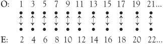 Cantor’s theory involves sets (a set is simply a collection of objects). For example N = {1, 2, 3, 4, 5, 6, 7, 8, . . .} means the set of (positive) whole numbers. Once we have a set, we can talk about subsets, which are smaller sets within the larger set. The most obvious subsets connected with our example N are the subsets O = {1, 3, 5, 7, . . .} and E = {2, 4, 6, 8, . . .}, which are the sets of the odd and even numbers respectively. If we were to ask ‘is there the same number of odd numbers as even numbers?’ what would be our answer? Though we cannot do this by counting the elements in each set and comparing answers, the answer would still surely be ‘yes’. What is this confidence based on? – probably something like ‘half the whole numbers are odd and half are even’. Cantor would agree with the answer, but would give a different reason. He would say that every time we have an odd number, we have an even ‘mate’ next to it. The idea that both sets O and E have the same number of elements is based on the pairing of each odd number with an even number: