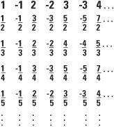 The set of fractions Q is a larger set than N in the sense that N can be thought of as a subset of Q. Can we write all the elements of Q down in a list? Can we devise a list so that every fraction (including negative ones) is somewhere in it? The idea that such a big set could be put in a one-to-one correspondence with N seems impossible. Nevertheless it can be done.