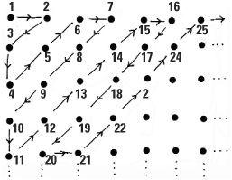 By displaying all the fractions in this way, potentially at least, we can construct a one-dimensional list. If we start on the top row and move to the right at each step we will never get to the second row. However, by choosing a devious zig-zagging route, we can be successful. Starting at 1, the promised linear list begins: 1, −1, ½, ⅓, −½, 2, −2, and follows the arrows. Every fraction, positive or negative is somewhere in the linear list and conversely its position gives its ‘mate’ in the two-dimensional list of fractions. So we can conclude that the set of fractions Q is countably infinite and write card(Q) =
