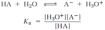 Acids differ in their ability to donate H+. Stronger acids, such as HCl, react almost completely with water, whereas weaker acids, such as acetic acid (CH3CO2H), react only slightly. The exact strength of a given acid HA in water solution is described using the acidity constant (Ka) for the acid-dissociation equilibrium. Recall from general chemistry that the concentration of solvent is ignored in the equilibrium expression and that brackets [ ] around a substance refer to the concentration of the enclosed species in moles per liter.