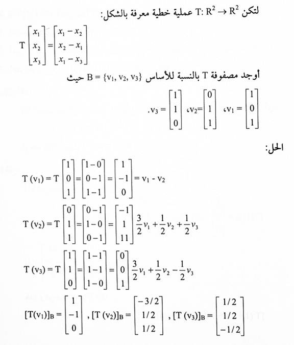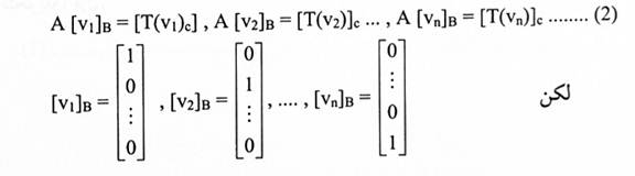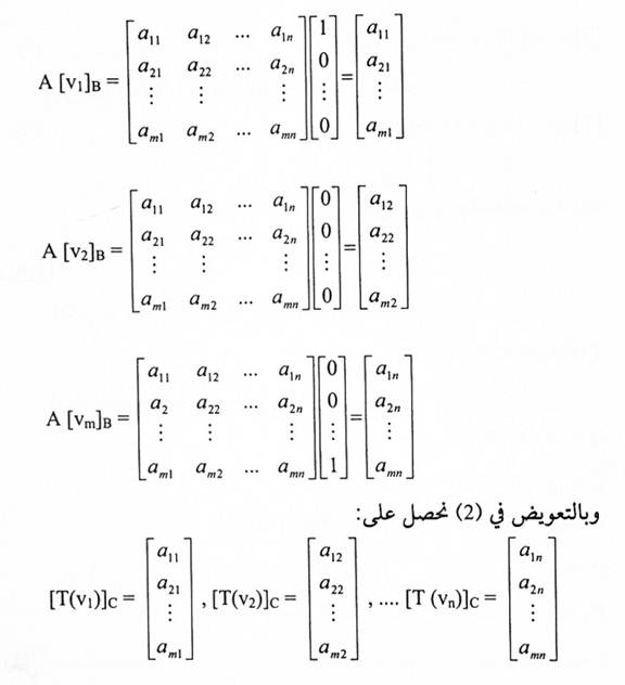 لاحظ أن العلاقتين (6) و (7) تنصان على أن مصفوفة T مضروبة في مصفوفة إحداثيات x هي مصفوفة إحداثيات T(x).