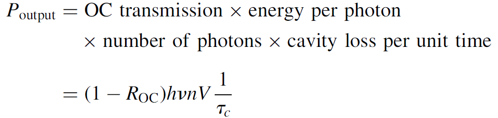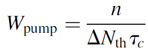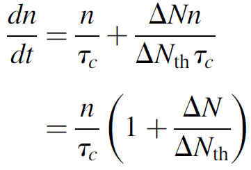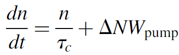 where τc is the lifetime of a photon in the cavity, ΔN is the population inversion at any given time t, and Wpump is the pumping probability. The left side of the equation (n/τc) represents the rate of photon loss in the cavity simply the number of photons divided by the lifetime of a photon and the right side of the equation represents the rate of photon gain simply the inversion times the pumping probability. We may now simplify the equation knowing that the pump rate can be expanded according to