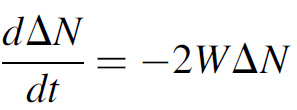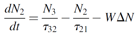 which is with added terms for stimulated processes where the first term represents input from the pump level; the second term, spontaneous decay. We may develop an exceedingly simply expression for dΔN/dt (the rate of change of the inversion) by making a few assumptions: namely, that the Q-switch pulse occurs so quickly that the effects of decay from the pump level (the first term) as well as the effects of spontaneous emission (the second term) are quite negligible during the time the actual pulse is generated. We also note that for a three level laser a loss of one atom from the ULL results in a gain of one atom in the LLL, so the total change in the difference (ΔN) is 2. The answer is then simply