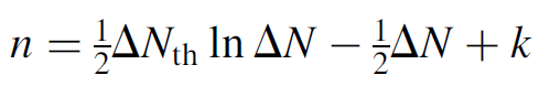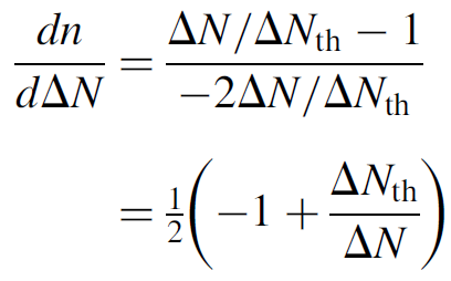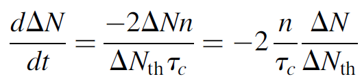 where the “2” in front corrects for the fact that the pulse is only half over when the threshold value is reached (assuming a symmetrical pulse). The term dt/dΔN can then be substituted for the inverse of equation (1.6) (also in terms of ΔN). Constant terms (such as ROC, hv, and threshold inversion ΔNth) are pulled out of the integral and several terms cancel, to yield a simple integral: