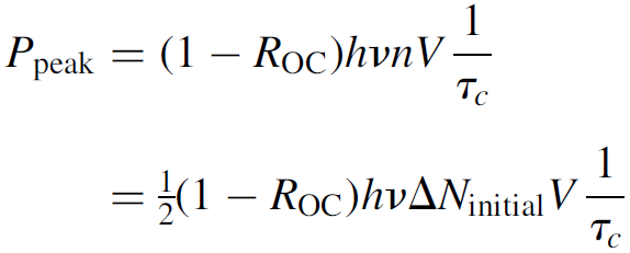 An exceedingly simple result! Bear in mind that assuming pulse termination at the threshold inversion and then multiplying by 2 is indeed a simplification of the problem, since real Q-switched pulses usually have a longer tail. The estimate provided here will yield an answer somewhat lower than the actual output, although results will vary according to the ratio of ΔNinitial /ΔNthreshold, but generally it is found to be within 20% of experimental results. Peak power is of particular interest for a Q-switched laser since this is the reason for using the technique in the first place. At peak power, the rate of change of the number of photons will be zero (i.e., at the top of the peak itself, where the curve is essentially horizontal). Setting dn/dt = 0 in equation (1.3), we find that the peak power occurs when ΔN = ΔNth [of course, we knew this already since we used it as a basis for the simplification in equation (1.13)]. By substituting this value into equation (1.10), we can obtain an exact expression for the number of coherent photons per unit volume at the peak of the pulse. Further simplification is possible if we assume that ΔNinitial is much, much larger than ΔNth (logical since this is required to produce giant pulses), so we can neglect many terms in the result to find that