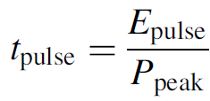 You will recall that τc represents the total distributed losses (of coherent photons) in the cavity. This expression, then, gives the instantaneous power of the pulse (in watts) at any time t. The total energy of the pulse can be determined by integrating the power over the entire time frame of the pulse: