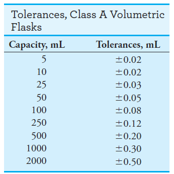 Volumetric flasks (as shown in below) are manufactured with capacities ranging from 5 mL to 5 L and are usually calibrated to contain (TC) a specified volume when filled to a line etched on the neck. They are used for the preparation of standard solutions and for the dilution of samples to a fixed volume prior to taking aliquots with a pipet.