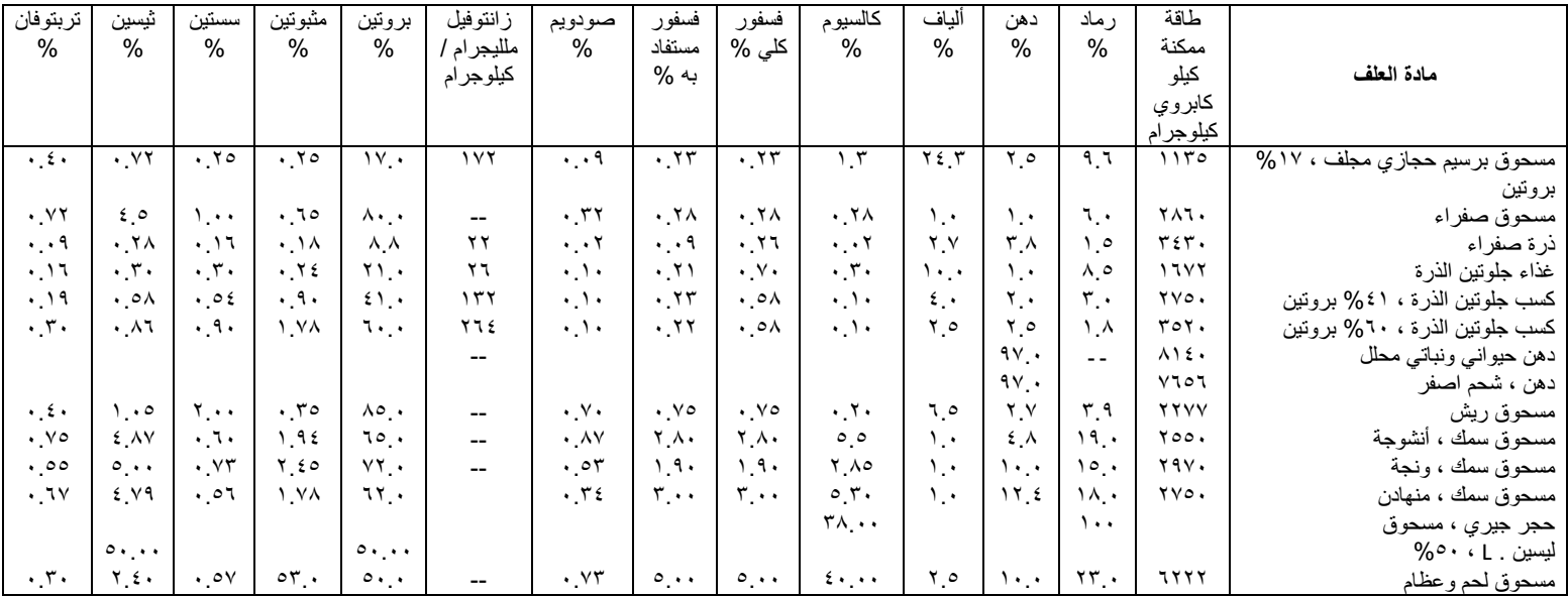 والمواصفات والاحتياجات لعلائق دجاج اللحم تتغير باستمرار، والجدول التالي مبين به تركيب بعض مكونات الأعلاف الشائع استعمالها في تغذية دجاج اللحم.