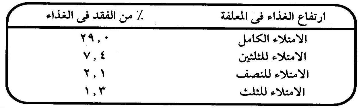 والنتائج التالية تظهر أهمية تدريب القائم بالعمل في مسكن الدواجن في أن يحافظ على المستوى المطلوب للغذاء في المعلفة.