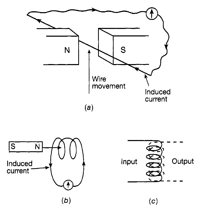 Figure 1.2: (a) Current induced in a moving wire; (b) current induced in a coil by a moving magnet; (c) the physical basis