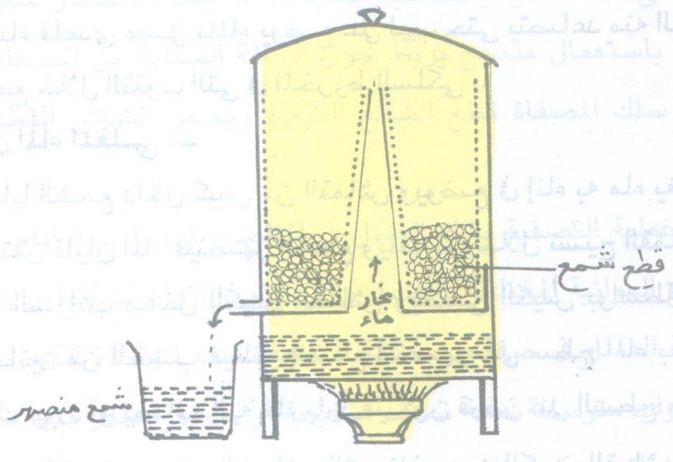 - بعد تمام انصهار الشمع يوقف التسخين ويرفع الكيس وتترك المياه لتبرد ويتجمد الشمع على سطحها حيث يتم كشطه.