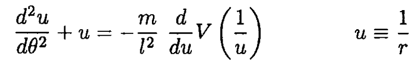 The solution may be obtained most quickly by employing the differential equation for the orbit, whereby the time dependence is eliminated from the equation of motion. The derivation proceeds from the definition of angular momentum which is conserved in central force motion, and consists of the substitution of (l/mr2) (d/dθ) for d/dt. In its final form, the equation reads as follows: