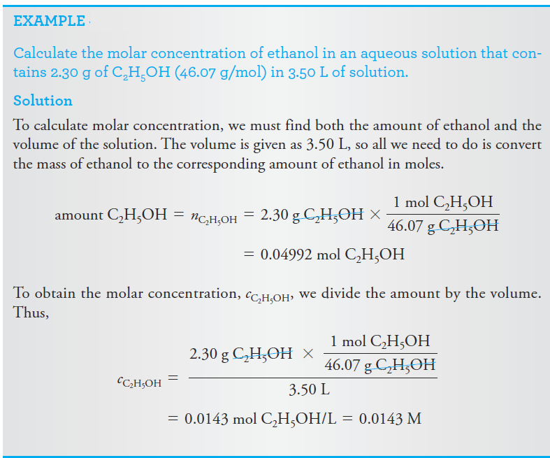 In terms of the number of moles of solute, n, and the volume, V, of solution, we write