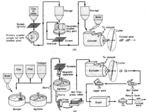 - يزال معظم الماء ( ويهدر ) في مرشح مكبسي . ويزال الهواء بالكامل في خلاطة الطين بمساعدة التفريغ ومدى التقطيع . مما يؤدي الى الحصول على خزف اقوى واكثف واكثر انتظاما .