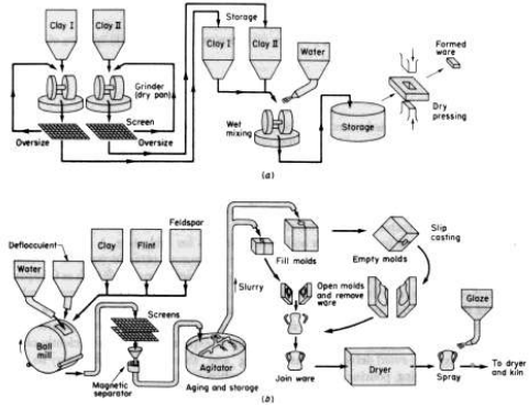تصنيع الخزف الصيني Porcelain . نختار الخزف الصيني كما عرفناه اعلاه لشرح الطريقة النموذجية للتصنيع في هذه المجموعة . هناك تصاميم ثلاثة لإنتاج الخزف الصيني بـ الاسلوب السائل wet - process، تستخدم لإنتاج مواد عزل ناعمة الحبيبات عالية اللمعان للخدمة العالية الفولطية ، والخزف الصيني بـ الاسلوب الجاف ، الذي يستخدم لتسريع انتاج القطع ذات البنية الاكثر انفتاحا والاخف فولطية ، و الخزف الصيني الصب ، وهو ضروري لصنع قطع كبيرة ومعقدة جدا بالطريقتين الاخريين . وتقوم هذه المعالجات الثلاث على اساس المواد الخام نفسها ، لان الاختلافات في التصنيع تكمن الى حد كبير في مراحل التجفيف والصوغ ( التشكيل ) . تتضمن الصورة 1- 1 شرحا للأسلوب السائل . ويمكن تجزئة مخطط الانتاج الى الخطوات المتتابعة التالية :