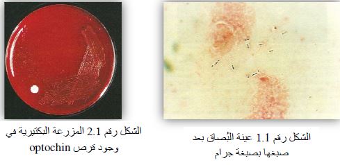 أ- من خلال المزرعة البكتيرية التي تمت تنميتها معملياً، وصبغ المستعمرات البكتيرية النامية بصبغة جرام ، نلاحظ كما في الشكل رقم 1.1 أن الخلايا البكتيرية عبارة عن مكورات موجبة لصبغة جرام متواجد على هيئة أزواج تحيط بها حافظة كبيرة ، ويتم ملاحظة هذه الحافظة بوجود هالة حول الخلايا البكتيرية بعد صبغها. ويعتبر الأشخاص الذين أجريت لهم عمليات استئصار الطحال من اكثر الأشخاص عرضة للإصابة بهذا النوع البكتيريا ، وعليه فإنه يجب على هؤلاء الأشخاص ان يتناولوا ولفترة زمنية طويلة المضاد الحيوي البنسيلين عن طريق الفم كإجراء وقائي phenoxymethy 1 penicillin, penicillin V وإذا أمكن تحصينهم بلقاح ضد الالتهاب الرئوي peneumovax II وذلك قبل إجراء عملية الاستئصال.