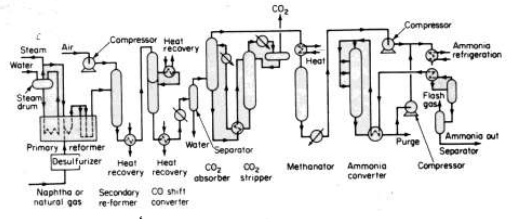 بعد ازالة CO2 بالماء وبعد حدوث الامتصاص الكيميائي ، تتحول كليا اية ثمالة من CO و CO2 في جهاز المثينة methanator الى ميثان . الميتان غاز خامل فيما يتعلق بمادة الامونيا الحفازة . والمسالة المهمة في كامل المعالجة هي المحافظة على الحرارة واعادة استخدامها ، ويقال بأن مصنع الامونيا هو في الواقع مصنع لإنتاج البخار وينتج الامونيا بصورة عرضية . فهو ينتج البخار اكثر بكثير مما ينتج الامونيا ( 4 : 1 ) .
