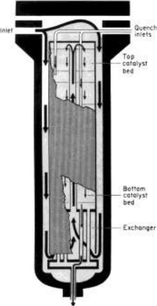 الصورة 1-1 . محول الأمونيا التركيبية . يتألف المحول من غلاف ذو ضغط عال يحتوي على جزء حفاز ومبادل حراري . والجزء الحفاز غلاف اسطواني يتلاءم مع الغلاف الضغطي من الداخل ، تاركا حيزاً حلقياً بين الاثنين . يحتوي الجزء الحفاز على عدة أسرة تستند الى شبكات حجب . وللمحافظة على درجة حرارة مثالية للمادة لإعطاء أعلى مردود ، تحقن السقاية بغاز التغذية على البارد قبل كل سرير حفاز . يحتوي السرير العلوي على أقل البارد من المادة الحفازة . وبما أن تدرج درجة الحرارة أكثر ثباتاً في الأسرة التالية فإن حجوم الأسرة تتدرج ، بحيث يكون أكبرها في الأسفل . يقع المبادل الحراري تحت الجزء الحفاز . فيسخن مسبقاً الغاز الجديد الداخل بالغاز الحار المتفاعل القادم من آخر سرير حفاز . تسمح مسبق وتؤمن التحكم بدرجة الحرارة لأول سرير حفاز .