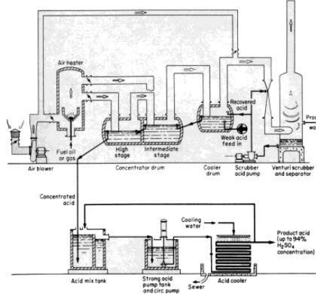 يظهر في الصورة 1 - 1 جهاز تركيز بنفخ الهواء . يؤمن الموقد الغازات عند 600 مئوية عن طريق حرق الزيت او الوقود الغازي . تنفخ هذه الغازات الحارة ٠ على شكل تيار معاكس لحمض الكبريت في حجرتين في اسطوانة التركيز فتزيل الماء بقبقبتها عبر الحمض . تمر الغازات المنطلقة عند 230 - 250 مئوية من الحجرة الاولى في الاسطوانة الى الحجرة الثانية ، اضافة الى جزء من الغازات الحارة من فرن الاحراق . وتغادر عند 170 - 180 مئوية لتدخل اسطوانة تبريد الغاز ، حيث يتم تبريدها الى 100 - 125 مئوية وترفع الحمض المخفف الى نقطة غليانه . وبما ان بعضا من حمض الكبريت يسحب كضباب ، فان الغازات الحارة تمر عبر جهاز غسل فتوري وفرازه دوامية cyclone وتغسل بحمض التغذية او بالماء لإزالة الضباب الحمضي قبل تفريغه الى الجو. يخفف هذا الاجراء الحمض الى 35 ملغ/ م 3 ويتطلب توظيفات مالية اقل بكثير مما يتطلبه المرسب الالكتروستاتي للضباب . كما انه يعطي حمضا بتركيز نهائي نسبته 93 % او اعلى بقليل . تعمل
