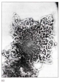 FIGURE 1: (a) Dictyosomes are stacks of flattened vesicles; the edges form a network of tubules and small vesicles. (b) With rapid dictyosome activity, as in these mucilage-secreting cells, the cytoplasm may almost fill with dictyosome vesicles, and fusion of vesicles with the plasma membrane is so abundant that the plasma membrane appears scalloped (X 12,000). (c) Face view of dictyosome isolated from a plant cell; the network of peripheral tubules is visible (X 60,000). (b and c, Courtesy of H. Mollenhauer, Texas A&M University)