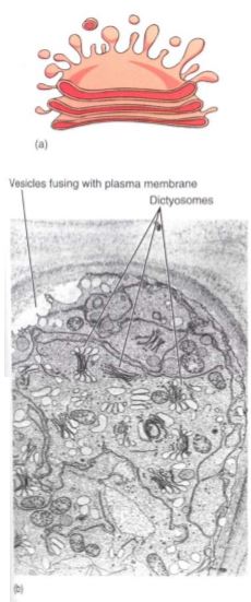 Much of the material that is to be secreted by a cell must first be modified by a dictyosome, a stack of thin vesicles held together in a flat or curved array (Fig. 1). ER vesicles accumulate on one side of the dictyosome, then fuse together and form a wide, thin vesicle called a cisterna (pl.: cisternae) that becomes attached to the dictyosome (Fig.2). Soon more ER vesicles gather next to this one and form a new cisterna. The first cisterna becomes embedded more deeply in the dictyosome as more vesicles accumulate on that side, which for obvious reasons is the forming face. At the other side, the maturing face, vesicles are being released; their contents have been processed. After separation, vesicles can move to the plasma membrane and release their contents. The outer edges of dictyosomes form an interconnected network of curving tubes, and these may absorb the contents from the center of the dictyosome cisterna, then detach and move away. It is not known why some dictyosomes concentrate material in the central cisternae whereas others use the peripheral ones.