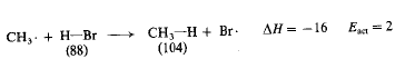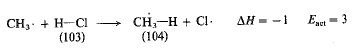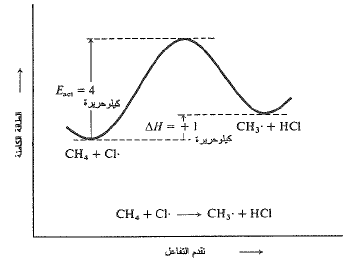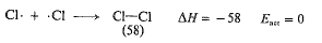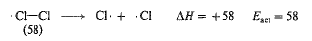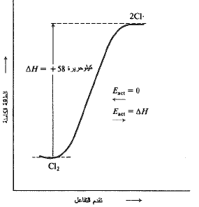 ولقد عد هذا الأمر، بشكل عام، صحيحاً في التفاعلات التي تتضمن اتحاد زوجين من الجذور الحرة. إذ لا يوجد هضبة نتسلقها لدى الانتقال من ذرتي كلور الى جزيء كلور، بل ببساطة هناك ميل انحداري، يجب أن يتضمن شطر جزيء كلور، ببساطة، صعوداً مائلاً، كما هو مبين في الشكل (3.1). وهكذا، فإن طاقة تنشيط (Eact) تحطم جزيء الكلور؛ ويجب أن تساوي (AH) (58 كيلو حريرة). يعتقد، بشكل عام، أن هذه المساواة بين (Eact) و (AH) قائمة في التفاعلات التي تتفكك فيها الجزيئات الى جذور حرة.