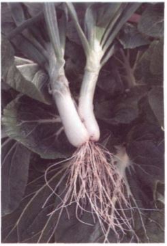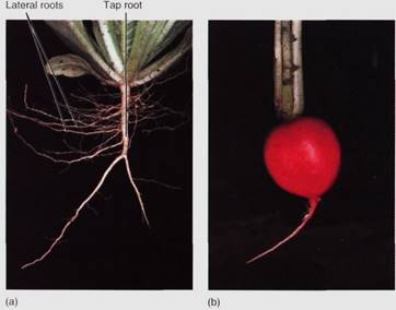 FIGURE 2: (a) The taproot of this tobacco seedling (Nicotiana tabacum) is definitely larger than the lateral roots, but more importantly, its development can be traced directly to the embryo. Relative size is not the critical factor; in many species lateral roots are the ones that become enlarged. (b) The roots of radishes are obviously taproots.
