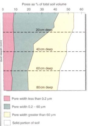 FIGURE 8: Much of a soil is composed of spaces between soil particles; in the uppermost 20 cm of a soil composed of sandy loam, 54% of the soil is pore space. Of this, 9% consists of extremely fine spaces less than 0.2 µm wide, 33% spaces ranging between .0.2 and 6.0 µm, and 12% large spaces wider than 60 µm. At deeper levels, the soil is more compacted, containing only about 42% pore space; the decrease is due mostly to a compaction of the intermediate-size spaces.