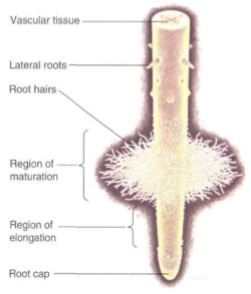 Just behind the root cap and root apical meristem is a zone of elongation only a few millimeters long within which the cells undergo division and expansion (see Fig, 6). Behind it is the root hair zone, a region in which many of the epidermal cells extend out as narrow trichomes. Root hairs can form only in a part of the root that is not elongating or they would be shorn off.