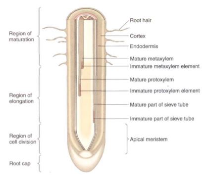 FIGURE 6: Although the exterior of a root appears rather uniform, several distinct zones of differentiation are present internally. Root hairs form only above the elongation zone, and the endodermis and first vascular tissues appear earlier than do root hairs.