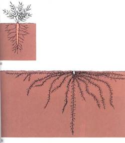 Roots must have an enormous absorptive surface; in order for a single root to have sufficient surface area, it would have to be hundreds of meters long, which would make conduction impossible (Table 1). Instead, plants have a highly branched root system (Fig. 1). Most dicots have a single prominent taproot that is much larger than all the rest and numerous small lateral roots or branch roots coming out of it (Fig. 2). This taproot develops from the embryonic root, called the radicle, that was present in the seed; after germination it grows extensively and usually becomes the largest root in the system. Carrots, beets, turnips, and other taproots sold in stores have dozens of fine lateral roots while growing, but these are removed before the products are shipped to market.