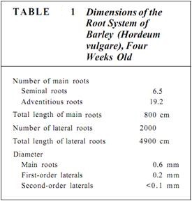 Root hairs greatly increase the root's surface area. In a study of rye, a single plant was found to have 13 million lateral roots with 500 km of root length and a surface area of 200 m2. Because of the abundant production of root hairs, however, the total surface area was doubled. The presence of root hairs has other effects that should not be overlooked. Most pores in soil are too narrow for a root (usually at least 100 µm in diameter) to penetrate (Fig. 8). But root hairs, being only about 10 µm in diameter, can enter any crevice and extract water and minerals from it. Furthermore, carbon dioxide given off by the respiration of root hairs combines with soil water to form carbonic acid, which helps to release ions from the soil matrix. Without the acid, ions would be too firmly bound to soil particles for the root to absorb them Root hairs are unicellular, never have thick walls, and are extremely transitory. They die and degenerate within 4 or 5 days after forming.