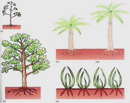 FIGURE 4: (a) A young dicot has a few leaves and a small root system; the narrow trunk with a few vascular bundles can conduct water and nutrients between them. (b) An older dicot has more leaves and a larger root system; the stem has more wood and bark, which increases the capacity to conduct water and sugar. Because most monocots do not undergo secondary growth, the stem of an older plant is not wider (d) than that of a young plant (c), and it has no increased conducting capacity. Consequently, the old plant has no more leaves or roots than the young plant. (e) If a plant can produce adventitious roots, the bottleneck of the monocot stem does not matter. New roots originate near the aerial shoots and conduct directly into them, and little or no long-distance conduction occurs in the rhizome. No part of the monocot stem needs to conduct all the water from all the roots to all the leaves and flowers, as does the trunk of a dicot.