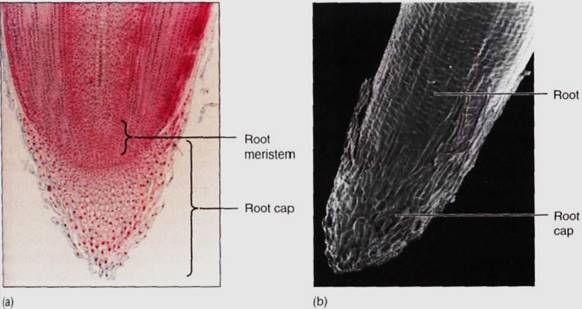 FIGURE 7: (a) The root cap of this corn root is distinct from the root proper. The root apical meristem is located at the apex of the root proper but is buried under the root cap. Because no leaves, leaf traces, or branches are present, cells develop in an extremely orderly fashion in regular files. It is easy to see that these cells of the primary body of the root are derived directly from the meristem (X 150). (Bruce Iverson) (b) Scanning electron micrograph showing the root cap margin. As cells are damaged by being pushed through the soil, they die and break off the cap (X 1000). (Photo Rearchers)