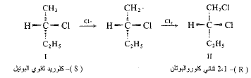 لنأخذ (S)- كلوريد ثانوي البوتيل، أنه يدور مستوي الضوء المستقطب نحو اليمين، ولنأخذ في الحسبان القسم من التفاعل الذي يعطي 2,1- ثنائي كلورو البوتان. لنصنع نموذجاً I للجزيء الأولي، مستعملين كرة وحيدة من أجل –C2H5، وكرة منفصلة لكل ذرة في –CH3. نتبع الخطوات المألوفة في الآلية ونزيح –H من –CH3 ونضع محلها –CI.