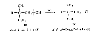 يمكننا أن نرى دون أن نعرف آلية هذا التفاعل أن الرابطة كربون – أكسجين قد تعرضت للكسر، ولم تتعرض أي رابطة مع المركز الكيرالي للكسر. ولذلك يستبقى التشكيل مع بقاء –CH2CI شاغلة الموضع النسبي نفسه في المنتج الذي كان مشغولاً بـ -CH2OH في المتفاعل. نضع الكلوريد في أنبوب، ثم نضع الأنبوب في جهاز الاستقطاب، فنجد أن مستوى الضوء المستقطب قد دار الى اليمين، وهذا يعني أن المنتج هو (+) -1- كلورو -2- ممثيل البيوتان وبما أن للمركب (-) -2- ممثيل -1- البيوتانول التشكيل III، فيجب أن يكون للمركب (+) -1- كلورو -2- ممثيل البيوتان التشكيل IV.