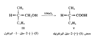 أو نؤكسد (-) -2- ممثيل -1- البيوتانول ببرمنغنات البيوتاسيوم فنحصل على حمض 2- مثيل البيوتانويك، ونجد أنه يدور مستوى الضوء المستقطب نحو اليمين. مرة أخرى لا يحصل كسر لأي رابطة مع المركز الكيرالي، ننسب التشكيل V الى حمض (+) -2- ممثيل البيوتانويك.