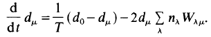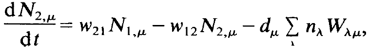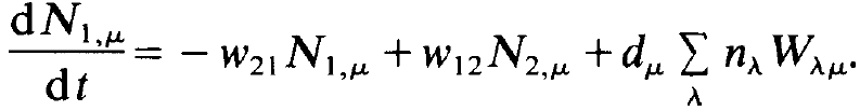 We shall omit this last term when we consider the laser process. A critical reader will quite rightly ask why no phase relations between the modes and the oscillating dipole moments of the electrons of the atoms are taken into account. In fact, (1.7) implies an approximation whose meaning we shall study in a later chapter. Eq. (1.7) can be obtained only if phase relations are neglected which is allowed in many cases but definitely not always. Indeed, very important effects in the laser, such as mode locking, are due to specific phase relations. The rate equations for the individual atom μ must take into account pump and relaxation processes and, in addition, the effect of stimulated emission and absorption. Because not only a single kind of photons but various kinds of photons are emitted, all the photon numbers must be taken into account. On account of these ideas we obtain the rate equations for the atom μ