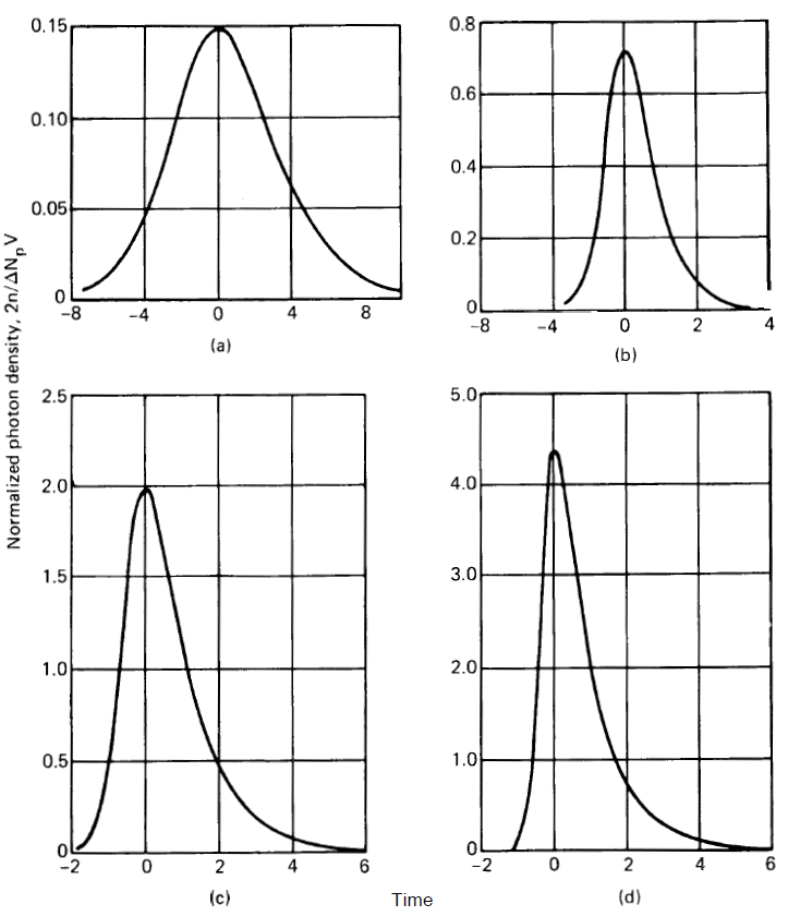 Fig. 1.1. Example of the time dependence of the emitted intensity of a Q-switching laser for various degrees of excitation.