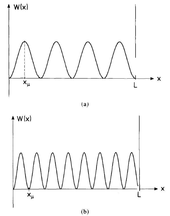 Fig. 1.2. The interaction function W versus the spatial coordinate x along the laser axis. L is the distance between the mirrors of the laser resonator, xμ the coordinate of atom μ. (a) x, coincides with an antinode; (b) x, coincides with a node.
