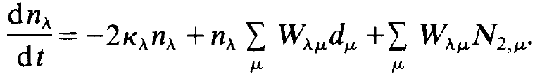 Evidently all factors within gμλ are known from our above considerations except for the last one which can be derived by an exact quantum mechanical calculation only. We are now in a position to formulate the laser equations. We assume that there exists a certain set of modes in the laser resonator and we distinguish them by the index A. Each mode can be occupied with a certain number of photons n,. Because the lifetimes of different modes in the resonator can be different we introduce decay constants Kλ which in general will differ from each other. Because the individual atoms interact with the laser modes in a different way we have to consider the atoms individually. For simplicity we again consider the 2-level scheme leaving its extension to a 3-level scheme as an exercise to the reader. We denote the occupation numbers of the atom p in the states 1 and 2 by N1,μ and N2,μ, respectively. The corresponding inversion of atom p is described by dμ = N2,μ – N1,μ. Generalizing we can immediately write down the laser equation for the mode A