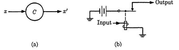 Figure 1-1 shows the notation we will use, a circle with C in the center, and one possible construction for this element in terms of relays. The input is designated x, so the output is x'.