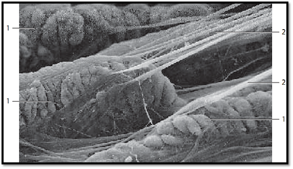 The functions of the ciliary body are accommodation and the release of ocular fluid. Both parts of the ciliary body are covered by a two-layered epithelium. The suspensor filaments for the lens (zonula filaments, zonula lentis, Zinn zonule) 2 extend from the surface of the ciliary processus 1 to the lens capsule. This establishes the connection between lens and ciliary muscle. There are thick suspensor fibers and thinner tensile fibers. The latter are not anchored in the ciliary epithelium but span the distance between ciliary fold and basal membrane of the non-pigmented epithelium. The thinner fibers may be considered part of the basal membrane. The figure shows the attachment of the zonula filaments to the walls of the ciliary processus.