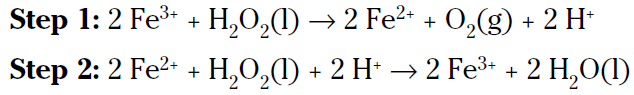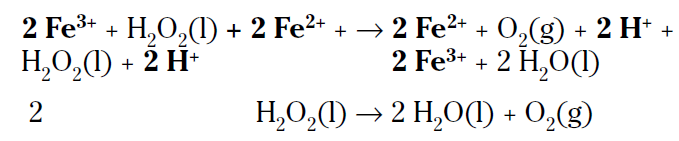 This is a slow reaction, especially if you keep the hydrogen peroxide cool in a dark bottle. The hydrogen peroxide in that bottle in your medicine cabinet may take years to decompose. But if you put a little bit of a solution containing the ferric ion in the bottle, the reaction will be much faster, even though it’ll be a two-step mechanism instead of a one-step mechanism: